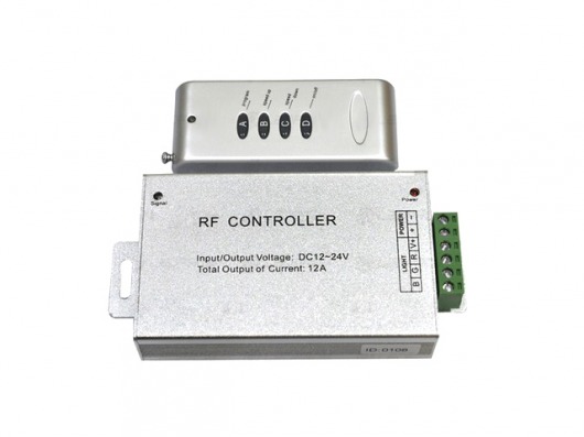 RGB-контроллер RF4K с напряжением 12/24V и мощностью 144/288W позволит вам управлять свечением светодиодной ленты с помощью пульта ДУ по радио-каналу.