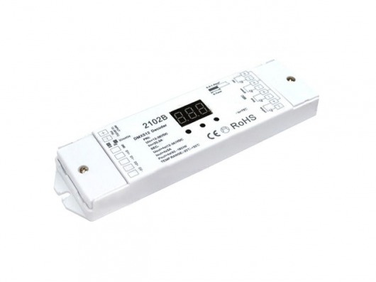 DMX декодер 2102B с напряжением 12/36V и мощностью 240/720W позволит вам управлять свечением сразу 4 подключенных каналов, а также каждым из них по отдельности. Т.е. прямо с корпуса декодера вы можете управлять не только светодиодной лентой, но и прожектором и др.