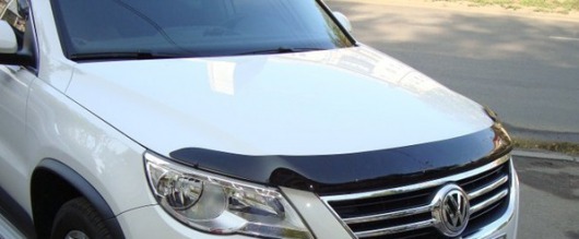 Дефлектор капота для Volkswagen Tiguan — это щиток из орг.стекла темного цвета, который крепится на переднюю часть капота. Благодаря тому, что дефлектор разработан специально для Volkswagen Tiguan от 2008 г.в., устанавливается он легко и быстро, при этом сверлить кузов вам не нужно. По форме же накладка полностью повторяет контуры капота. Данная модель прочна и долговечна: она надежно крепится, не боится коррозии, экстремальных температур и серьезных перегрузок.