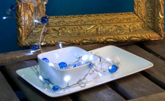 Светодиодная гирлянда «Mini Tablelight LED» выполнена в виде шаров и жемчужин (всего 24 штуки) цвета голубой океан. Данная led гирлянда сделана из 24 светодиодов белого свечения и питается от батареек (батарейки в комплект не входят). Световая гирлянда "Шары и жемчужины" поможет вам эффектно украсить и помещение, и новогодний стол.