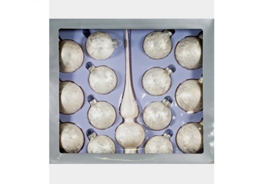 В набор PeneriGifts входит верхушка для елки и 14 шаров диаметром 6 и 7 см. Этого более чем достаточно, чтобы целиком нарядить даже самую высокую домашнюю ель. И вам не придется долго подбирать елочные украшения — в наборе есть все, что нужно. Даже не обязательно добавлять мишуру — любая елка и без нее будет выглядеть элегантно и самодостаточно. Матовые серебристые шарики из стекла смотрятся добротно, нарядно и гармонично. А легкие узоры из "инея" придают им особый шарм.