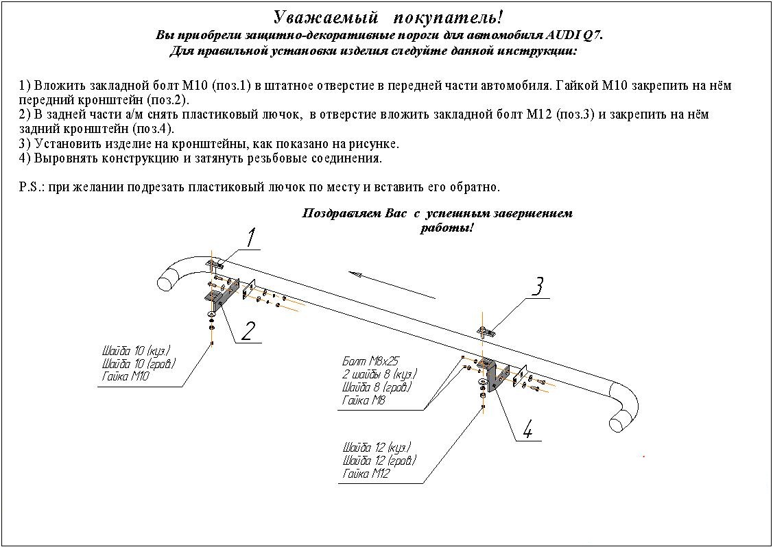 Боковые пороги-подножки сделаны специально для автомобилей Audi Q7, поэтому устанавливаются достаточно просто и без повреждений корпуса. Помимо этого, стальные пороги-трубы для Ауди Q7 смотрятся очень стильно и эффектно. Они добавят вашему авто еще больше солидности и внушительности.
