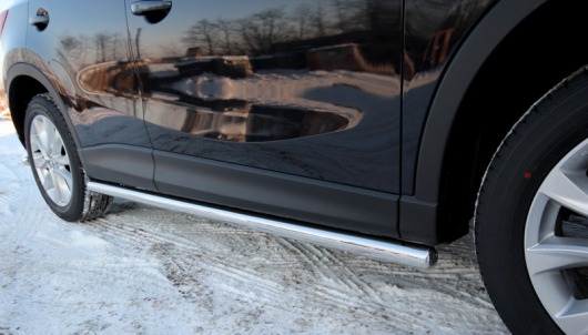 Боковые пороги-подножки сделаны специально для автомобилей Mazda CX-5 от 2012 г.в., поэтому устанавливаются достаточно просто и без повреждений корпуса. Помимо этого, стальные пороги-трубы для Мазда СХ-5 смотрятся очень стильно и эффектно. Они добавят вашему авто еще больше солидности и внушительности.