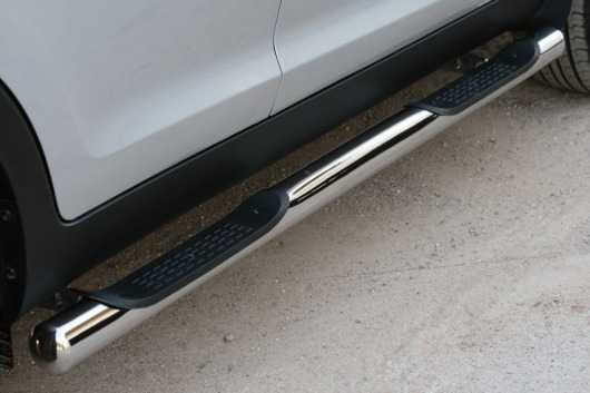 Пороги на Kia Sportage – это боковые подножки из нержавеющей стали диаметром 76 мм, которые позволяют более комфортно входить и выходить из салона автомобиля. Подножки Kia Sportage очень прочные, надежные и долговечные: они не боятся коррозии, сколов и царапин и выдерживают большие нагрузки.