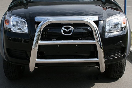 Передняя решетка Mazda BT-50 (кенгурятник) – это защитная дуга на бампер из нержавеющей стали диаметром 76 мм.