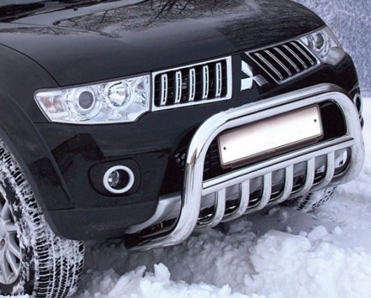 Передняя решетка Mitsubishi Pajero Sport (кенгурятник) – это защитная дуга на бампер из нержавеющей стали диаметром 76 мм.