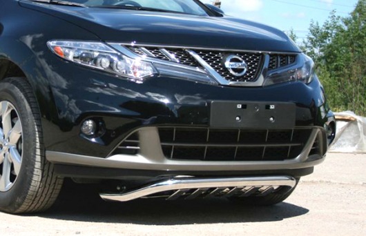 Нижняя защита переднего бампера с профильными элементами (акула) предназначена для автомобилей Nissan Murano от 2011 г.в. Вам не придется подгонять защиту под размеры бампера вашего авто. И с монтажом проблем не возникнет: установка защиты переднего бампера производится в штатные отверстия, а значит, необходимость сверлить кузов отпадает.