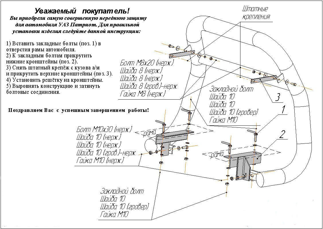 Защитная решетка переднего бампера предназначена для автомобилей УАЗ Патриот от 2005 г.в. Вам не придется подгонять передний кенгурятник под размеры кузова вашего авто. И с монтажом проблем не возникнет: установка кенгурятника УАЗ Патриот производится в штатные отверстия, а значит, необходимость сверлить кузов отпадает.