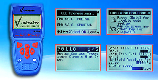 При этом, диагностический сканер V-Checker V500 — это полностью самостоятельное устройство, которое не требует подключения ноутбука или любого другого компьютера. Стоит лишь подсоединить автосканер к диагностическому разъему OBD2 (16 pin), — и он готов к работе.
