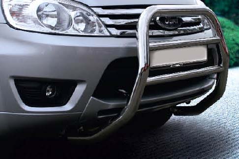 Решетка бампера Ford Escape защищает передний бампер автомобиля от различных механических повреждений при мелких ДТП и неудачных парковках, а также незаменима при езде по бездорожью. А кроме того, низкий мини-кенгурятник с двумя перемычками (диаметром 42 мм) Форд Эскейп смотрится очень стильно и эффектно. Он добавит вашему авто еще больше брутальности и солидности.