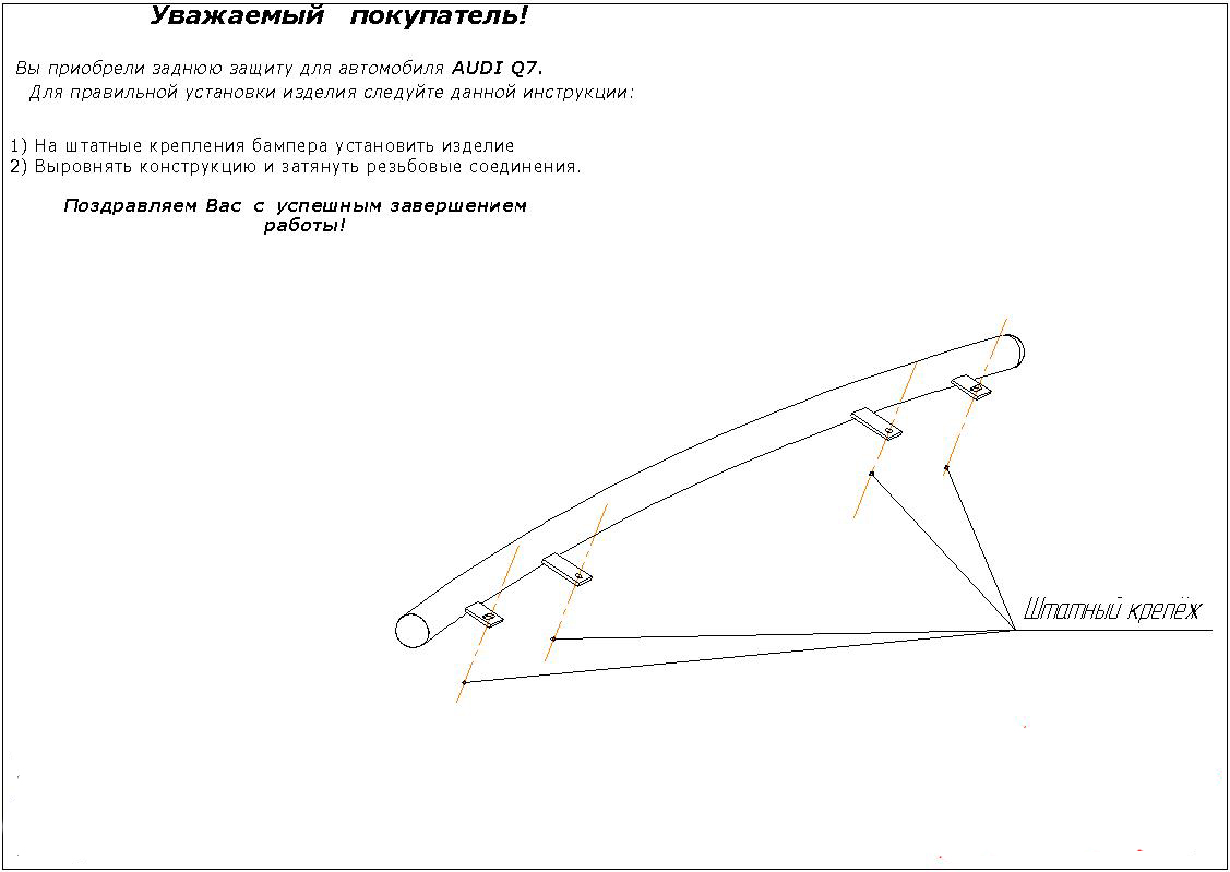 Защита заднего бампера труба предназначена для автомобилей Audi Q7. Вам не придется подгонять защиту под размеры бампера вашего авто. И с монтажом проблем не возникнет: установка защиты заднего бампера производится в штатные отверстия, а значит, необходимость сверлить кузов отпадает.
