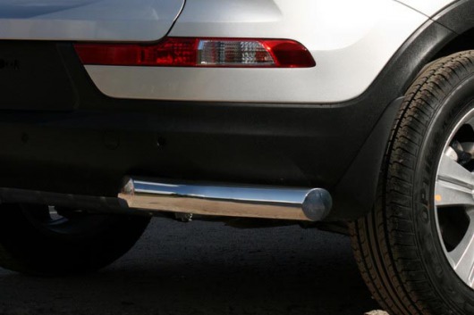 Защита заднего бампера для Kia Sportage – это защитные уголки на бампер из нержавеющей стали диаметром 76 мм.