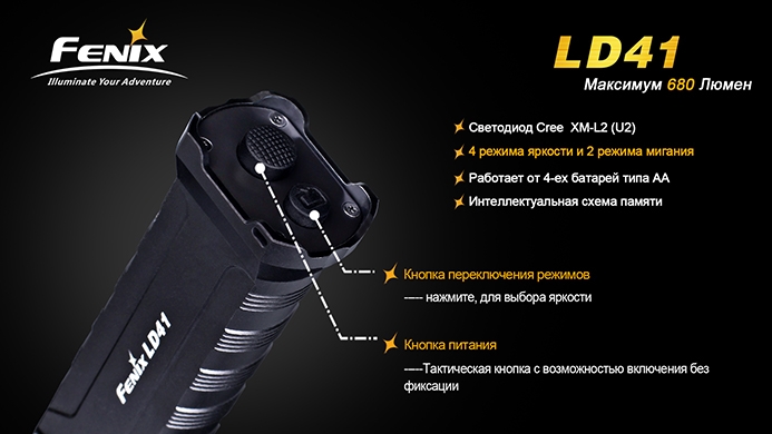 Фонарь Fenix LD41 с диодом Cree XM-L U2 — это обновлённая версия более раннего Fenix LD41 XM-L. Модель отличается повышенной яркостью (680 люмен против 520 люмен у предшественника). Очень надёжный, компактный и мощный фонарик идеально подойдёт для туристов, спелеологов, поисковиков и любителей прочего экстремального отдыха.