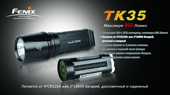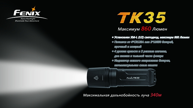 Поисковый фонарь Fenix TK35 — хит продаж, надёжный, удобный и мощный фонарь от компании Fenix. Это отличный туристический и поисковый фонарь, благодаря новому диоду и совершенной конструкции имеющий высочайшую мощность. Данная модель подойдёт прежде всего поисковикам, спелеологам, альпинистам — всем  тем, кому средних показателей яркости фонаря явно мало.