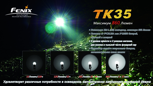 Как уже говорилось выше, поисковый фонарик Fenix TK35 является одним из самых ярких фонарей Fenix в своём классе. Современный светодиод Cree XM-L U2 LED обеспечивает сверхмощному фонарю Fenix максимальную яркость в 860 люмен. В результате световой луч универсального фонаря на максимальной яркости достигает длины в 340 метров! Всего же у модели 4 режима яркости: