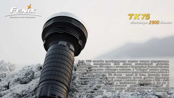 Конструкция TK75 очень рациональна и позволяет при сравнительно компактных размерах выдавать огромную мощность луча. Поисковым фонарём удобно пользоваться и на дальних расстояниях (мощный концентрированный луч), и вблизи (боковая засветка до 80 градусов даёт отличное панорамное освещение).