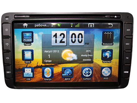 вывод AV с DVD проигрывателя на вторую зону, использование в качестве Wi-Fi роутера, голосовой ввод, доступ к интернету с помощью Wi-Fi USB модуля (в комплекте) и 3G USB модема (в комплекте), подключение iPod, подключение к кнопкам руля, подключение парковочных датчиков