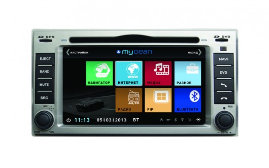 Штатная голова сделана на базе двухъядерного процессора частотой 1 Ггц семейства ARM Cortex с очень высокой производительностью. На ШГУ MyDean 1008 устанавливается операционная система WinCE 6.0 с полностью русифицированным меню. Сенсорный дисплей диагональю 6,2 дюйма, с разрешением 800х480 и высокой контрастностью позволяет отлично просматривать фото и видео всех основных форматов, включая видео высокой чёткости HD. Также Вы можете просматривать эфирное телевидение, для этого в штатную голову встроен аналоговый ТВ-тюнер.
