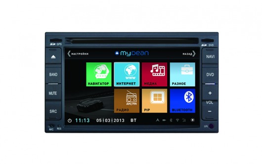 Штатная голова сделана на базе двухъядерного процессора частотой 1 Ггц семейства ARM Cortex с очень высокой производительностью. На ШГУ MyDean 3001-1 устанавливается операционная система WinCE 6.0 с полностью русифицированным меню. Сенсорный дисплей диагональю 6,2", с разрешением 800х480 и высокой контрастностью позволяет отлично просматривать фото и видео всех основных форматов, включая видео высокой чёткости HD. Также Вы можете просматривать эфирное телевидение, для этого в штатную голову встроен аналоговый ТВ-тюнер.