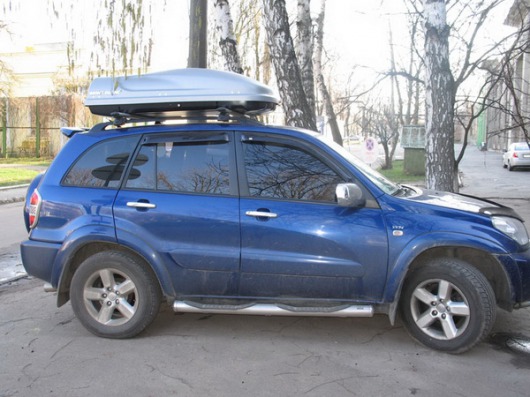 Обратите внимание! Сначала необходимо закрепить на крыше поперечины багажника, а потом уже на них ставится бокс. Если у вас нет поперечников, вы можете подобрать их для своей марки авто здесь.