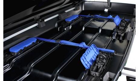 Багаж внутри бокса удерживается дополнительными ремнями, которые входят в комплект. Для более удобного открытия/закрытия крышки предусмотрены прочные газовые упоры. Вы сможете открывать бокс с обеих сторон автомобиля. Это особенно удобно в местах тесной парковки.
