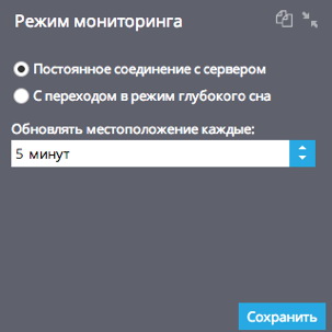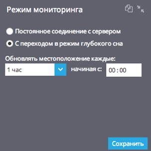 Режим постоянного соединения с сервером. Если вы включаете данный режим, то вам тоже, как и в энергосберегающем режиме, нужно выбрать интервал – от 1 минуты до 24 часов. Но трекер слежения постоянно включен, и за настроенный интервал он будет просто обновлять информацию о местоположении. И среднее время такой автономной работы составляет от 2-ух до 10-ти суток. Это зависит от условий приема сигналов GPS и GSM, а также от настроенной периодичности. Благодаря этому режиму вы можете получить самое детальное описание, к примеру, пути автомобиля.