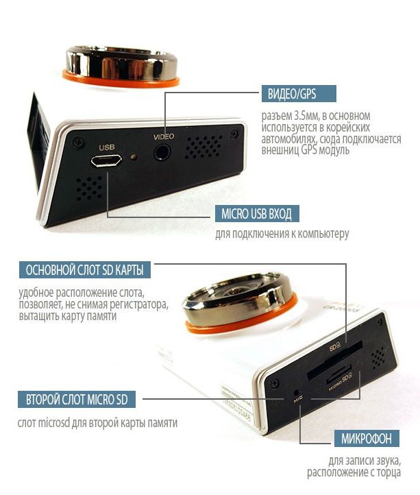 • Два слота карт памяти. Карта microSD используется для обычной записи видео, а на использование SD-карты авторегистратор переходит для записи в режиме парковки. Максимальный размер каждой из карт  – 32 гигабайта. Таким образом, вы получите сразу 64 Гб свободного места! Этого хватит, чтобы записать длительные видеоролики.