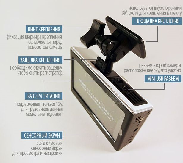 • Сенсорный дисплей диагональю в 3.5 дюйма. С его помощью вы сможете просмотреть записанное даже не выходя из машины, что очень полезно, когда нужно доказать свою невиновность при ДТП.