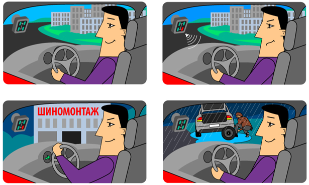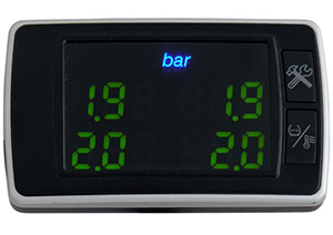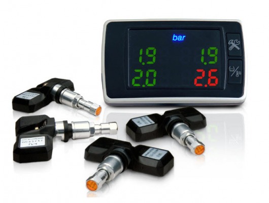 Датчик постоянно передает показатели давления и температуры на небольшой дисплей, который вы устанавливаете в любое удобное место в салоне автомобиля. Дисплей отображает данные в виде четырех цифр, которые располагаются соответственно колесам. Когда давление и температура одного из колес выходят за установленные вами пределы, система предупреждает вас звуковым и цветовым сигналами.
