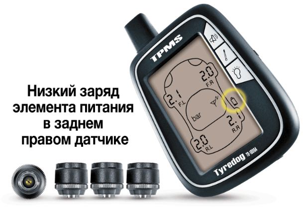 • Отображение не только температуры/давления в колесах, но и предупреждения о низком напряжении бортовой сети, а также низком заряде элемента питания.