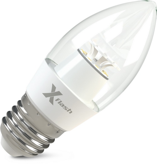 Светодиодная лампа X-Flash Candle E27 отлично подходит для общего и декоративного освещения. Колба лампы прозрачная, выполнена в виде пламени свечи. Лампа соответствует по форме, цоколю и размерам аналогичным компактным люминесцентным лампам и лампам накаливания. Может применяться в любых светильниках с цоколем типа «миньон». Данная модель рассчитана на напряжение 220 В. Мощность диодной лампы X-Flash — 6,5 Вт., яркость —520Лм,  угол освещения лампы более 270 градусов, а температура свечения – 4000 K (это белый свет).