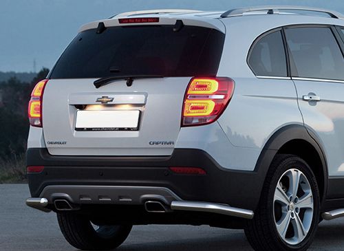 Уголки на задний бампер Chevrolet Captiva защищают задний бампер автомобиля от различных механических повреждений при столкновениях на дороге и неудачных парковках. А кроме этого, защита заднего бампера для Шевроле Каптива — это дополнительная деталь тюнинга.