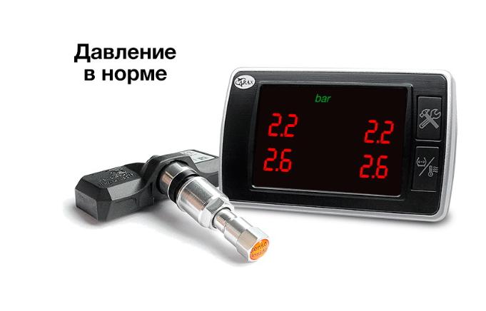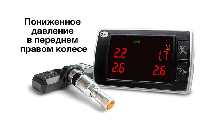 • Оповещение звуковым и световым сигналами. Когда давление и температура одного из колес выходит за установленные вами пределы, система предупреждает вас звуковым сигналом, а также подсвечивает цифру проблемного колеса на экране.