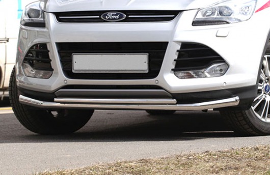 Защита переднего бампера труба Premium предназначена для автомобилей Ford Kuga  от 2013 г.в. Вам не придется подгонять защиту под размеры бампера вашего авто. И с монтажом проблем не возникнет: установка защиты переднего бампера производится в штатные отверстия, а значит, необходимость сверлить кузов отпадает.