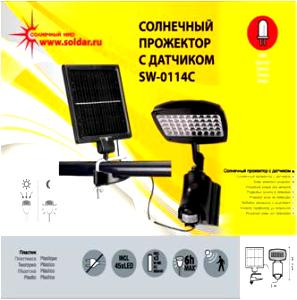 Солнечный светодиодный светильник SW-0114С не требует прокладки кабеля и не потребляет энергию от сети. Выносная солнечная панель имеет специальное крепление, которое позволяет устанавливать такую лампу на стене, заборе или столбе на участке. Влагозащищенный дизайн позволяет использовать ее в любую погоду. Солнечный светодиодный светильник SW-0114С - это качественный, стильный и абсолютно бесплатный свет для Вас и Ваших близких.
