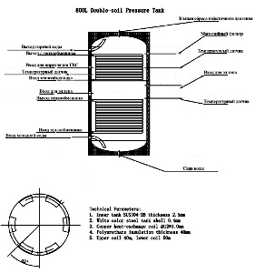 Максимальное давление: 6 МПа. Длина верхнего теплообменника составляет 40 метров, нижнего - 50 метров. Медная спираль теплообменника составляет 12 мм, а толщина - 1 мм. Полиуретановая пена толщиной 40 мм обеспечивает надежную теплоизоляцию.