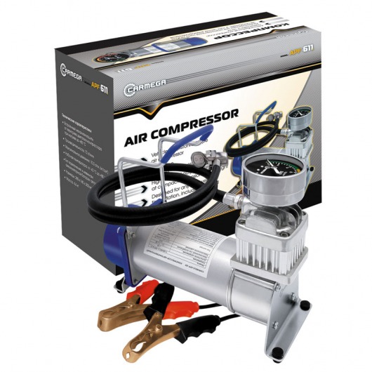 Поршневой компрессор Carmega APF-611 оборудован термореле, благодаря чему устройство автоматически выключится при нагреве свыше +85 °С. Кроме того, система, обеспечивающая постоянную смазку двигателя, длительное время позволит обойтись без дополнительного техобслуживания. Питание Carmega APF-611 производится непосредственно от аккумулятора автомобиля с помощью зажимов типа «крокодил». Корпус компрессора оснащен рукояткой для переноса устройства, а также для удобства транспортировки и хранения в комплект включена сумка.