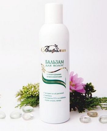 Бальзам для волос «Вифалия» с природными компонентами – косметическое средство для ухода за кожей головы и волосами. Бальзам для волос «Вифалия» содержит натуральные экстракты растений, СО2 – экстракт (купажа: чабрец, корень лопуха, хвощ), которые способствует насыщению волос питательными веществами и укреплению волос. Пантенол – обеспечивает регулирующее влияние на обмен в коже, оказывает противовоспалительное действие, способствуя устранению дефектов кожи и волос. Он улучшает кровообращение в коже, обеспечивает увлажняющий эффект, улучшает качество волос, придает им объем.