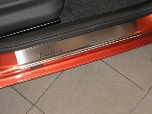 Внутренняя накладка на порог Skoda Fabia II — это аксессуар автомобильного тюнинга, который защищает внутренний порог от механических повреждений при посадке и высадке из машины. Декоративные накладки с рисунком на внутренние пороги предназначены для автомобилей Skoda Fabia II от 2007 г.в.
