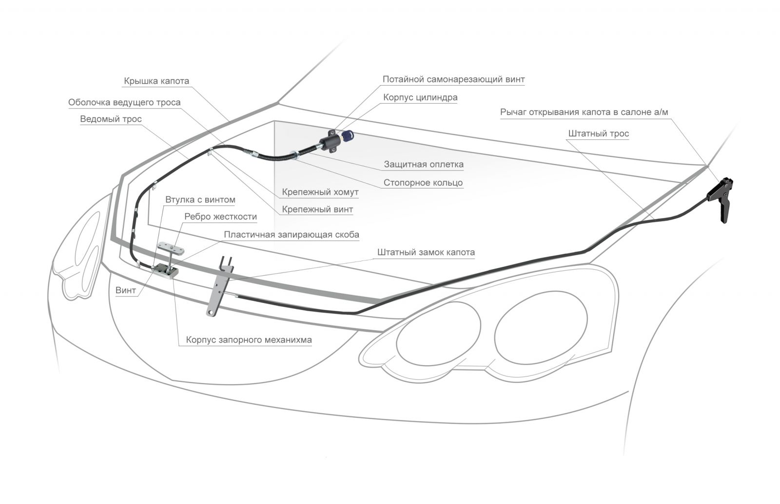 Механический замок капота Fortus Hood Lock Classic защищает ваш автомобиль от угона. Противоугонное устройство - эта система блокировки, которая управляет запорным механизмом с помощью специального троса с гибким корпусом.