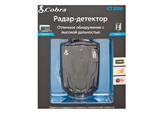 Автомобильный радар-детектор Cobra CT 5350 уверенно улавливает сигналы всех известных радарных и лазерных измерителей скорости. Не скроются от него и «неуловимые» Стрелка-СТ и Робот.