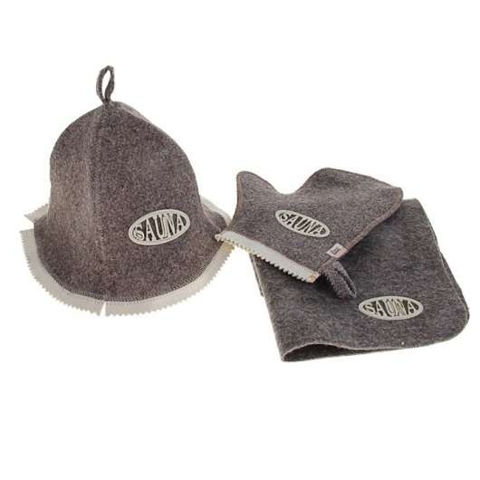 Шапка для сауны изготовлена из войлока, защитит голову от высоких температур. Без такой специальной шапки поход в сауну вообще не рекомендуется. В набор банных принадлежностей входит специальная войлочная рукавичка, которая поможет очистить поры вашего тела от грязи и шлаков, а также улучшит кровообращение во всем теле, что окажет благоприятное воздействие на весь организм в целом. Кроме того, в комплект входит мягкий удобный войлочный коврик, которым застилают лежанку.