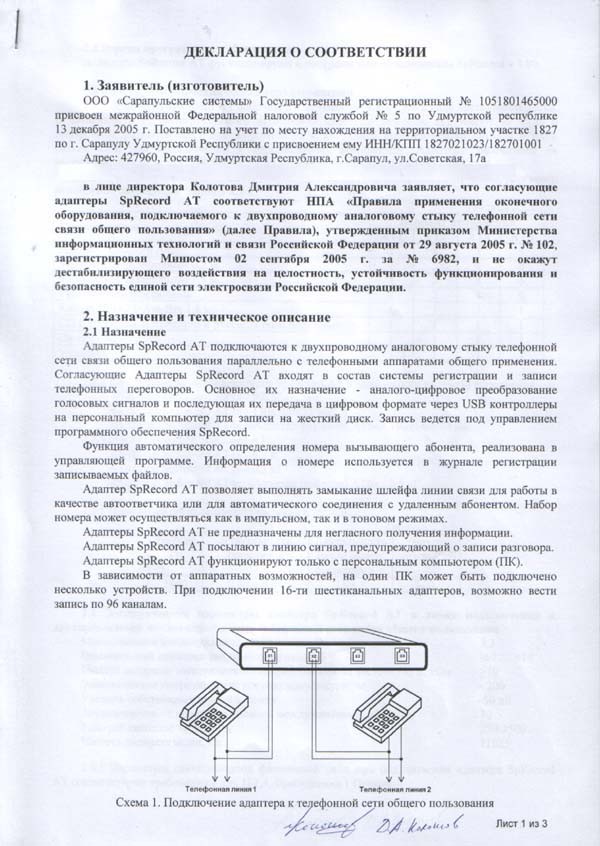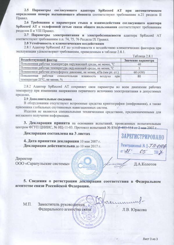 Устройство отвечает требованиям CE Евро Союза по электромагнитной совместимости (декларация) и имеет Свидетельство об официальной регистрации программы для SpyRecord.