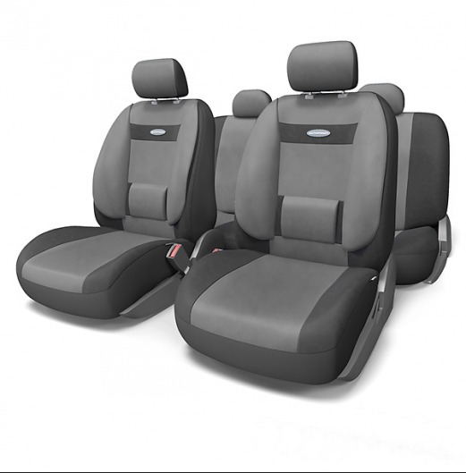 Надеваются накидки отдельно на сидение, отдельно на спинку автомобильных кресел. В комплекте 11 предметов, включая чехлы и на передние, и на задние сидения, а также 5 подголовников. Цвет чехлов: черный. На спинках передних сидений есть карман.