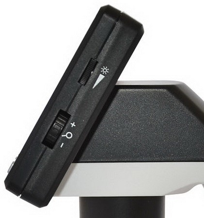 В корпусе вокруг линзы установлены 8 ярких светодиодов с белым свечением. Подсветка предназначена для традиционного наблюдения непрозрачных предметов (в падающем свете). Светодиоды отличаются низким энергопотреблением и качественным светом, питаются от встроенного аккумулятора и не требуют дополнительного питания. На торцевой части дисплея справа имеется регулятор яркости подсветки.