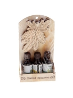 Масло пихты применяется для профилактики и лечения инфекционно-воспалительных заболеваний дыхательной системы и ЛОР-органов, обморожений и гипергидроза ног. Масло мяты прекрасный анальгетик, снимает менструальные, головные боли и мигрени. Применяется для лечения простудных заболеваний, различных воспалений верхних дыхательных путей, гриппа, насморка, бронхита. Масло эвкалипта является эффективным средством от головной боли, служит хорошей защитой от инфекционных заболеваний, производит тонизирующий и освежающий эффект, оказывает возбуждающее действие, способствует концентрации внимания. Эфирные масла упакованы в деревянную коробку, сделанную в виде полочки. В коробку также вложено три аппликатора для ароматизации помещения.