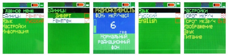 Индикатор радиации СОЭКС 01M имеет цветной дисплей и меню на русском языке, что позволяет считывать информацию в любых условиях и управлять устройством. С помощью меню можно менять единицы измерения (мкЗв/ч или мкр/ч), язык, задавать пороговые значения для запуска звукового оповещения, а также осуществлять другие настройки.