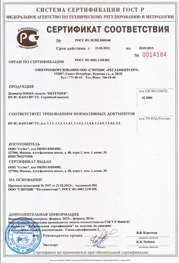 Дозиметр СОЭКС 01M Defender измеряет мощности гамма-, бета- излучения и рентгеновских лучей. После пробирования он анализирует полученную информацию и выводит на дисплей подсчитанные результаты. Принцип работы данного прибора почти не отличается от профессиональных счетчиков Гейгера-Мюллера. Время анализа полученных проб не превышает 20 секунд.