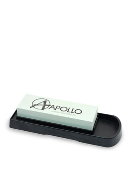 Точильный камень средней грубости для заточки кухонных ножей на подставке.
