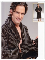 Благородный махровый халат высокой плотности. Изысканная вертикальная тонкая полоска, глубокие цвета, внешняя сторона велюровая, а внутренняя - петельчатая махра с легким массажирующим эффектом.